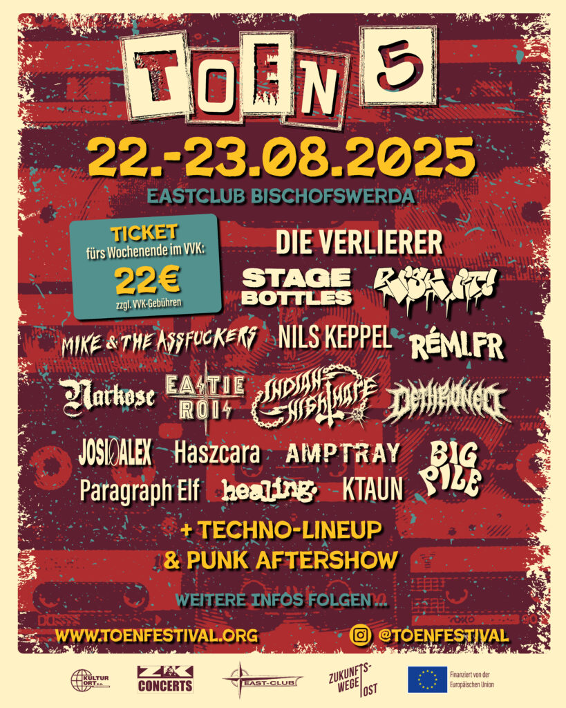 Das Schiebocker Kollektiv hinter dem TOEN-Geschehen, das sich im Kontext von Bischofswerdas EASTCLUB gar prächtig entwickelt, zählt im ländlichen Raum zu den engagiertesten Initiativen im Bereich subkultureller Bewegungen – Regungen, die so stark sind, dass sich die Gruppe aktiv in Inhalt und Umsetzung am WONNEMOND MMXXV beteiligt.